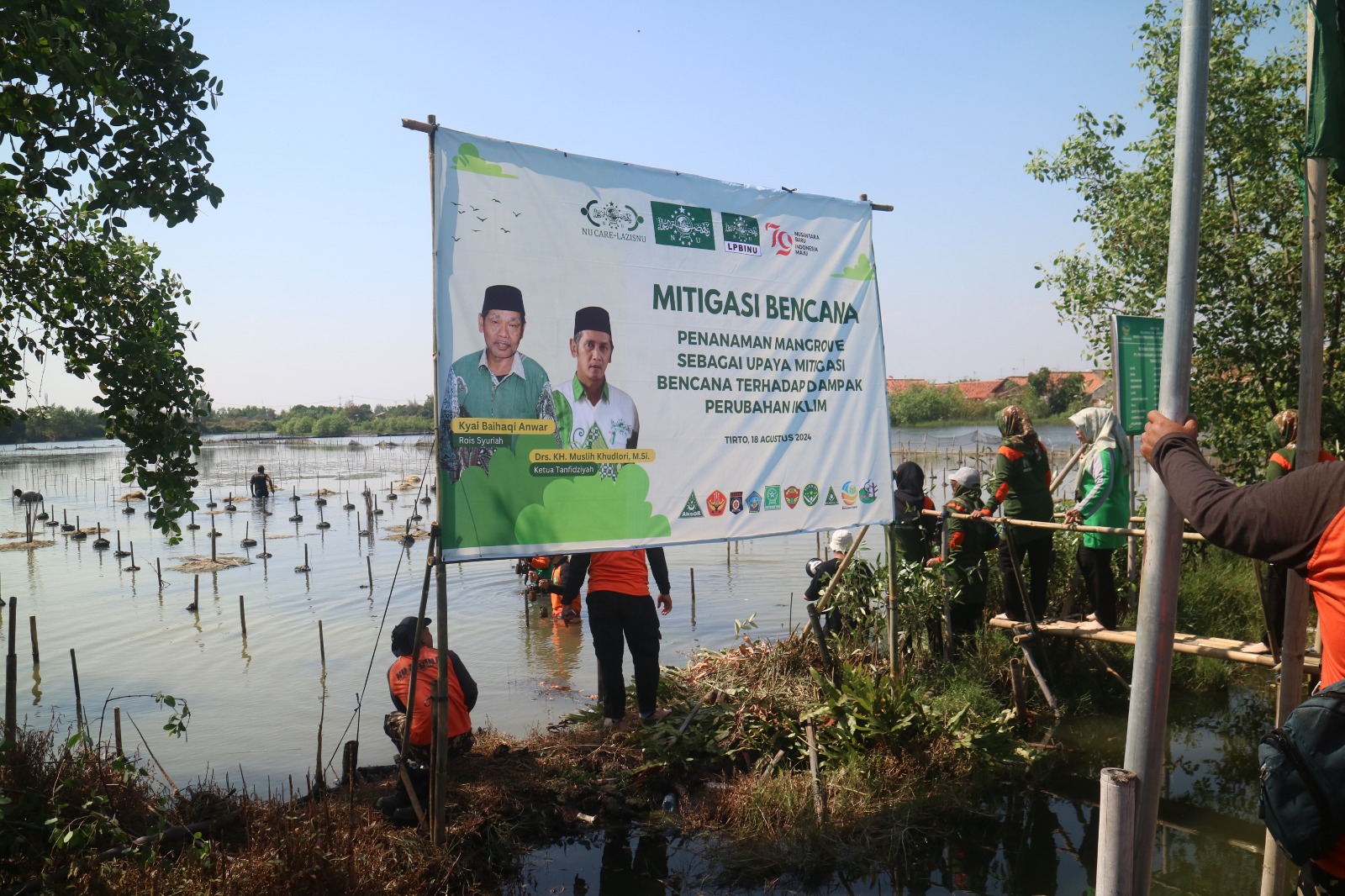 Pekalongan – Lembaga Penanggulangan Bencana dan Perubahan Iklim Nahdlatul Ulama (LPBINU) Kabupaten Pekalongan mengadakan kegiatan “Mitigasi Bencana Terhadap Dampak Perubahan Iklim” bertempat di Ekowisata Mangrove Mulyoasri, Desa Mulyorejo, Kecamatan Tirto, Ahad (18/8/2024).